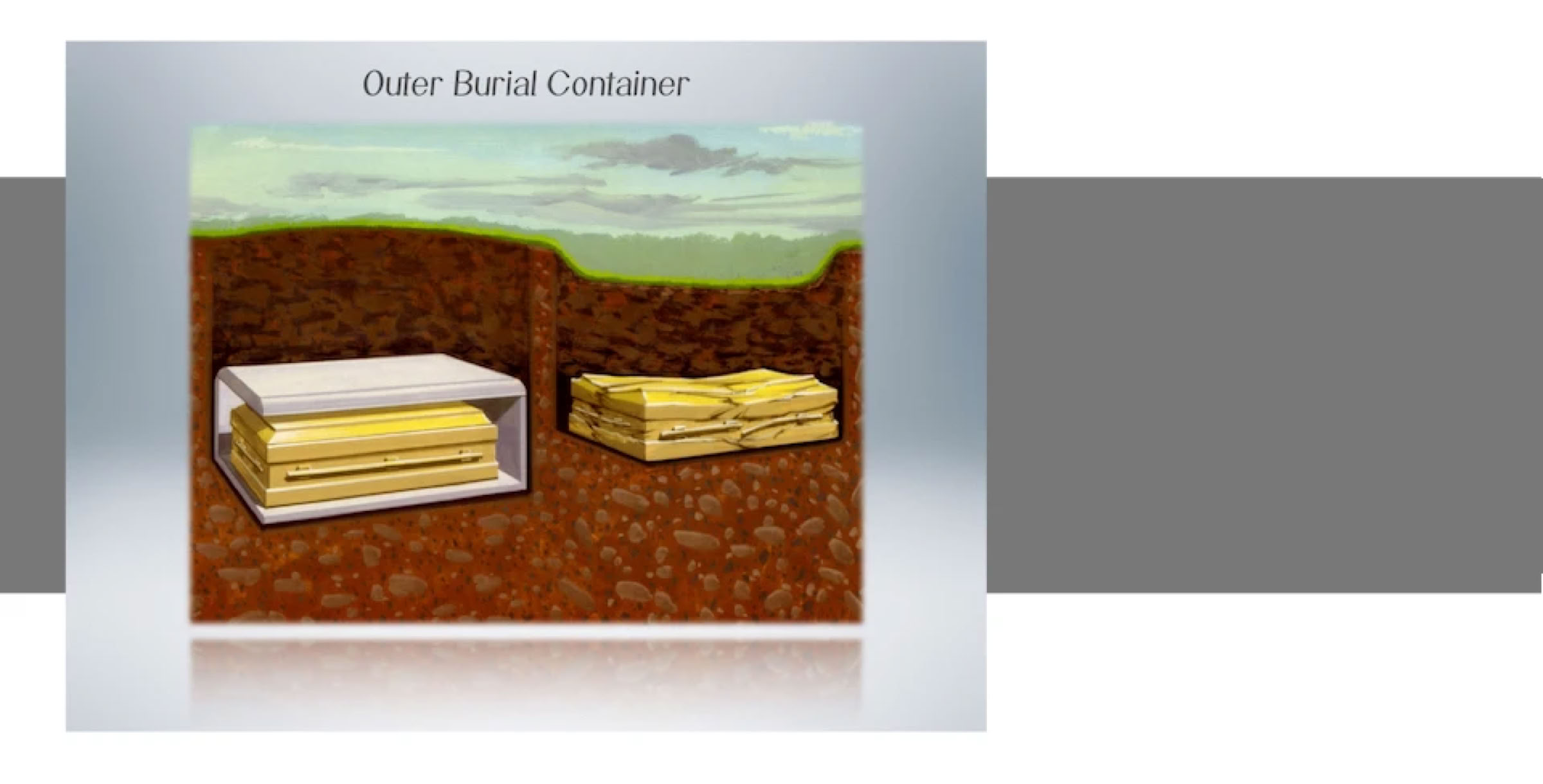 The only outer burial containers that we offer are called Lawn Crypts. This picture shows a double depth lawn crypt where two caskets can be stacked in one space. We don’t offer this stacked arrangement because our soil is too rocky to dig that deep, so just imagine that the lawn crypt is half as high and made for one casket. When we construct a lawn crypt, we first place a thick layer of gravel and then install the steel reinforced, concrete lawn crypt on top of it. More gravel is then placed on the sides forming something similar to a french drain. As rain water penetrates the ground it is able to trickle through the gravel rather than pooling around the lawn crypt. There is also a strategically placed drainage hole in the bottom of the lawn crypt. This drainage hole allows moisture that may enter the crypt to have an escape route so that it can trickle away through the gravel below.
