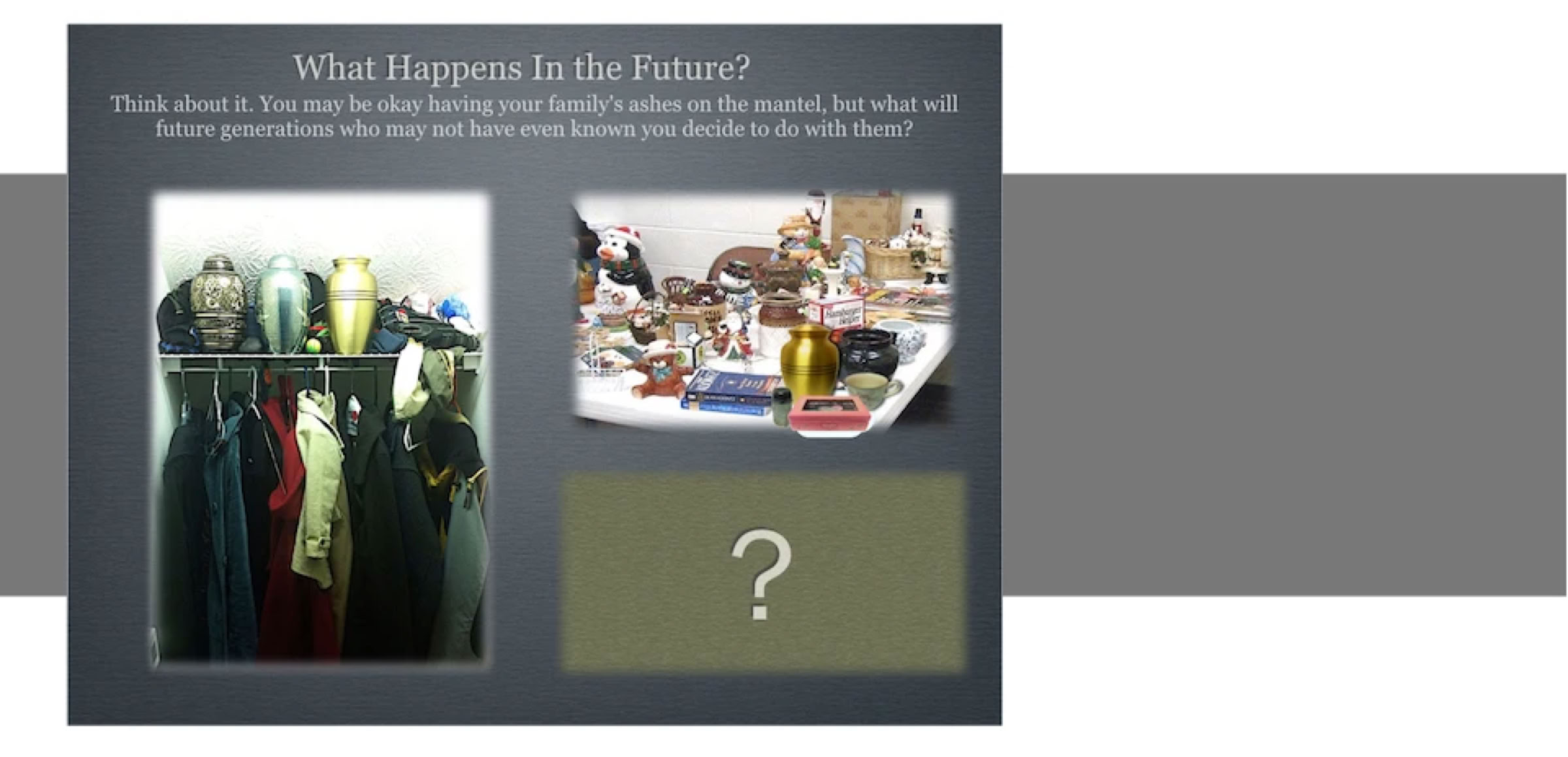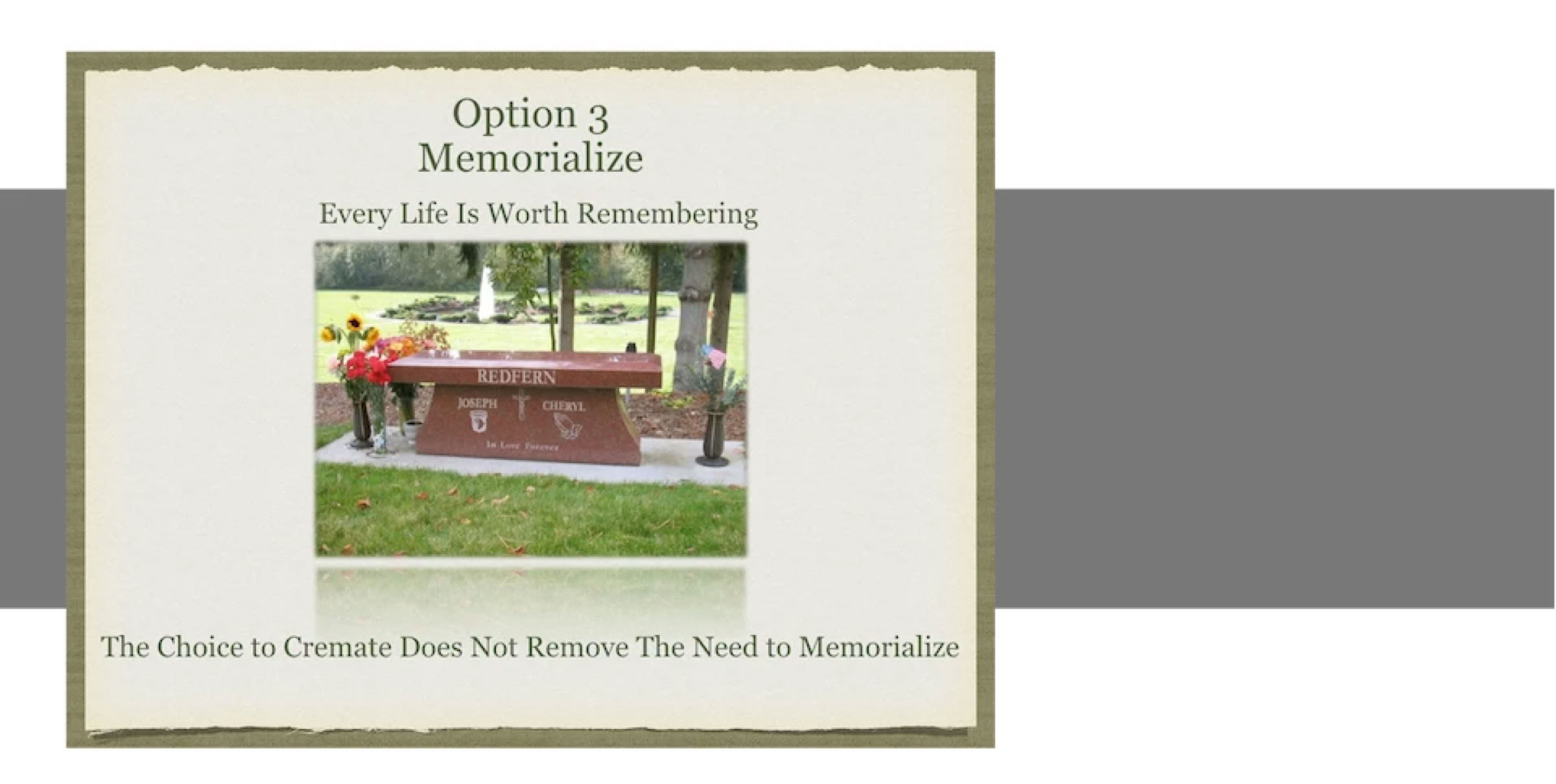 Option one is to turn your living room into a cemetery. You can place an urn on the coffee table or on the mantle and try to get on with life, but that’s not an easy thing to do because turning your living room into a cemetery has unintended consequences.