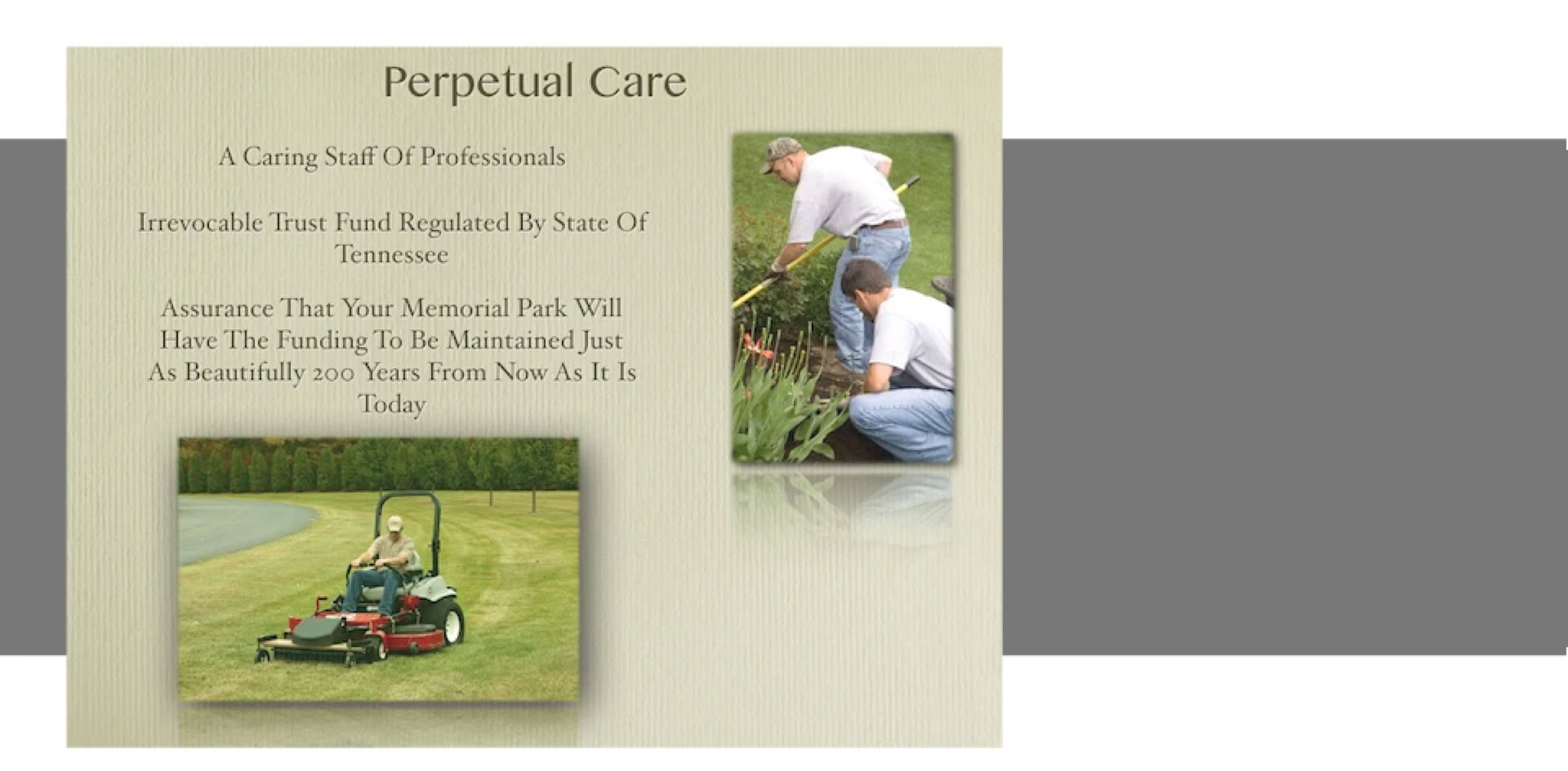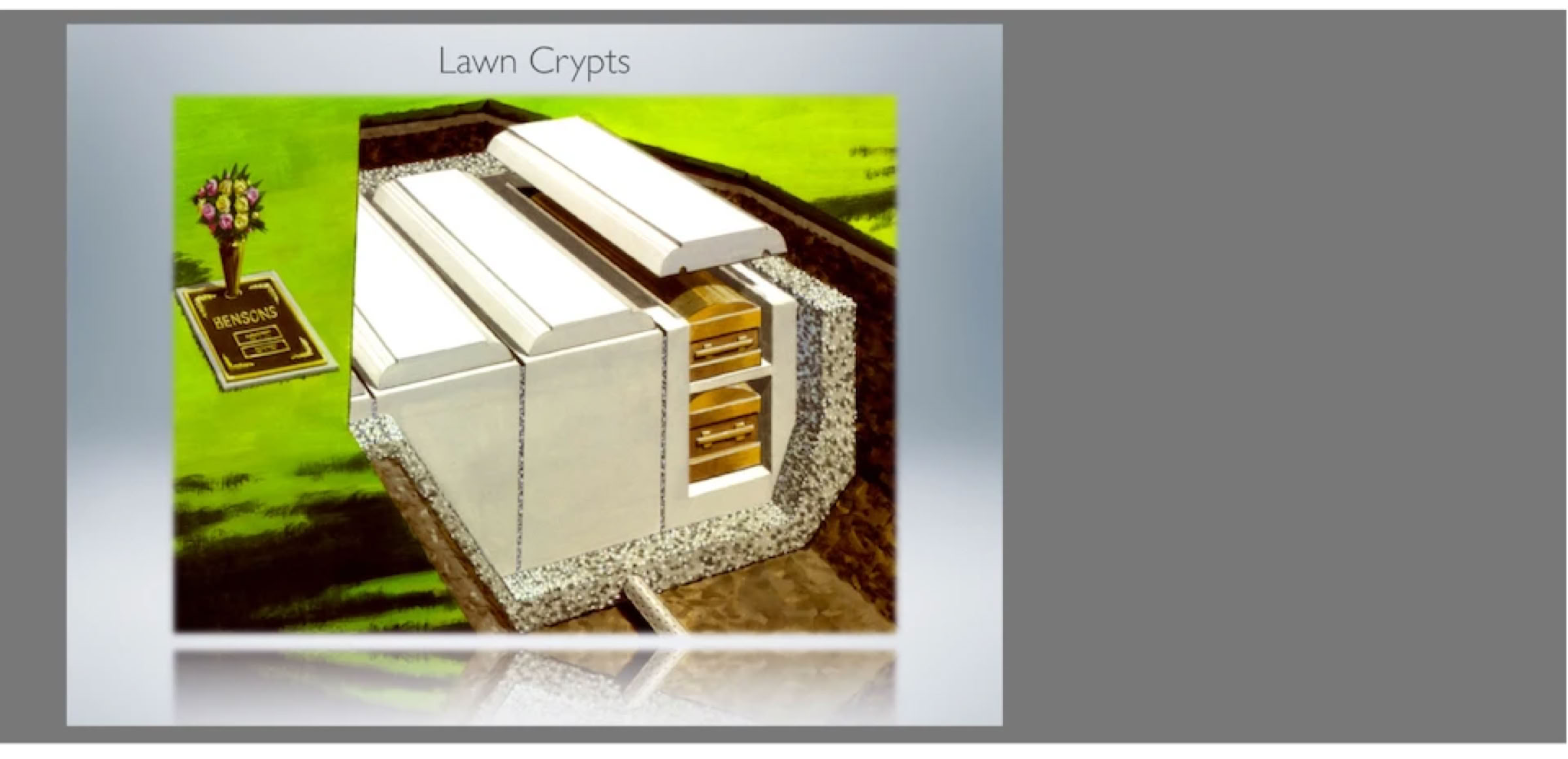 The only outer burial containers that we offer are called Lawn Crypts. This picture shows a double depth lawn crypt where two caskets can be stacked in one space. We don’t offer this stacked arrangement because our soil is too rocky to dig that deep, so just imagine that the lawn crypt is half as high and made for one casket. When we construct a lawn crypt, we first place a thick layer of gravel and then install the steel reinforced, concrete lawn crypt on top of it. More gravel is then placed on the sides forming something similar to a french drain. As rain water penetrates the ground it is able to trickle through the gravel rather than pooling around the lawn crypt. There is also a strategically placed drainage hole in the bottom of the lawn crypt. This drainage hole allows moisture that may enter the crypt to have an escape route so that it can trickle away through the gravel below.