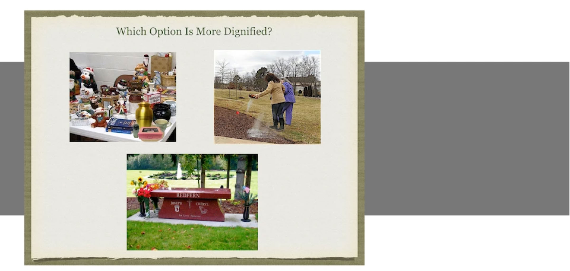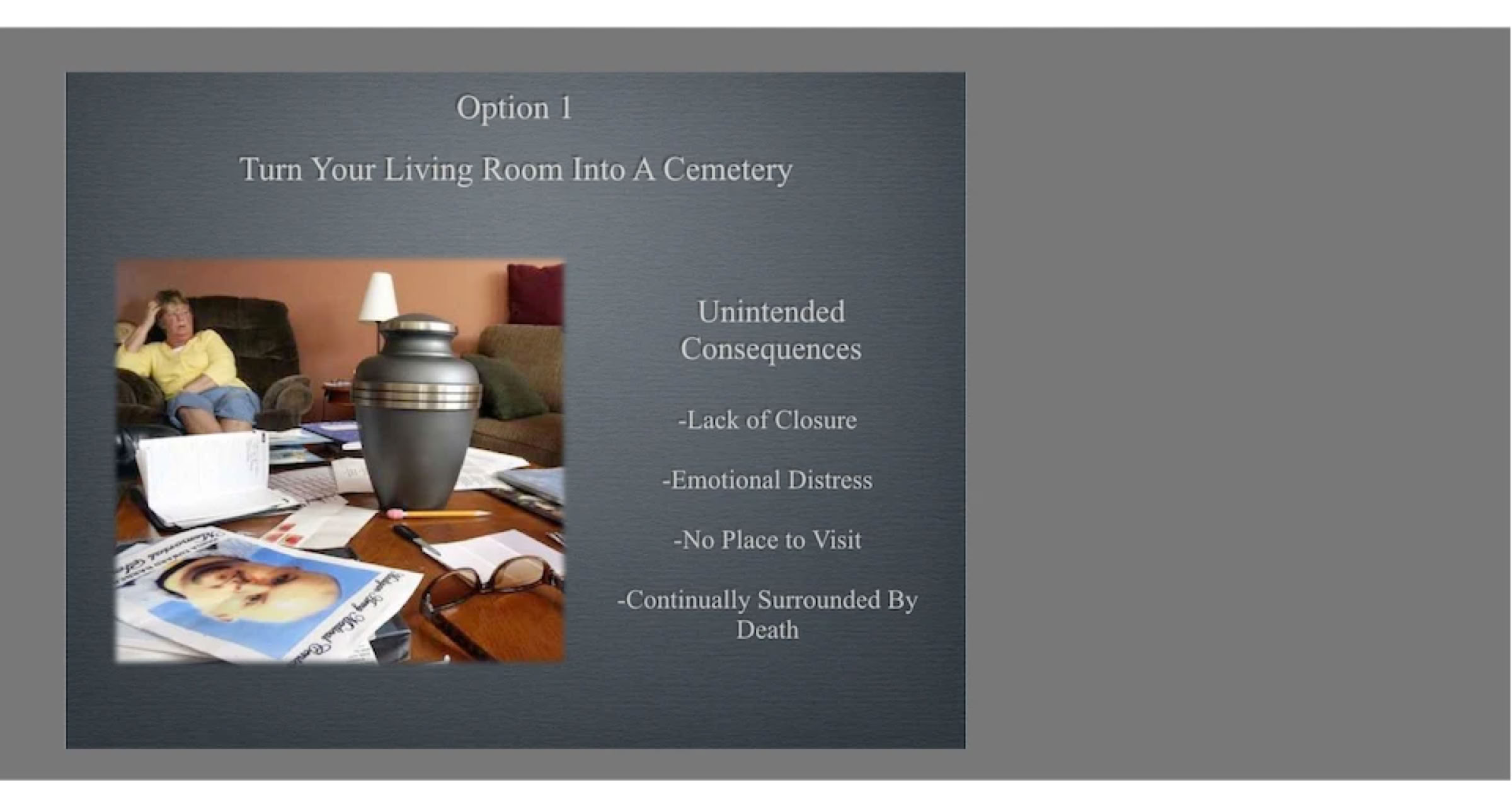 Option one is to turn your living room into a cemetery. You can place an urn on the coffee table or on the mantle and try to get on with life, but that’s not an easy thing to do because turning your living room into a cemetery has unintended consequences.